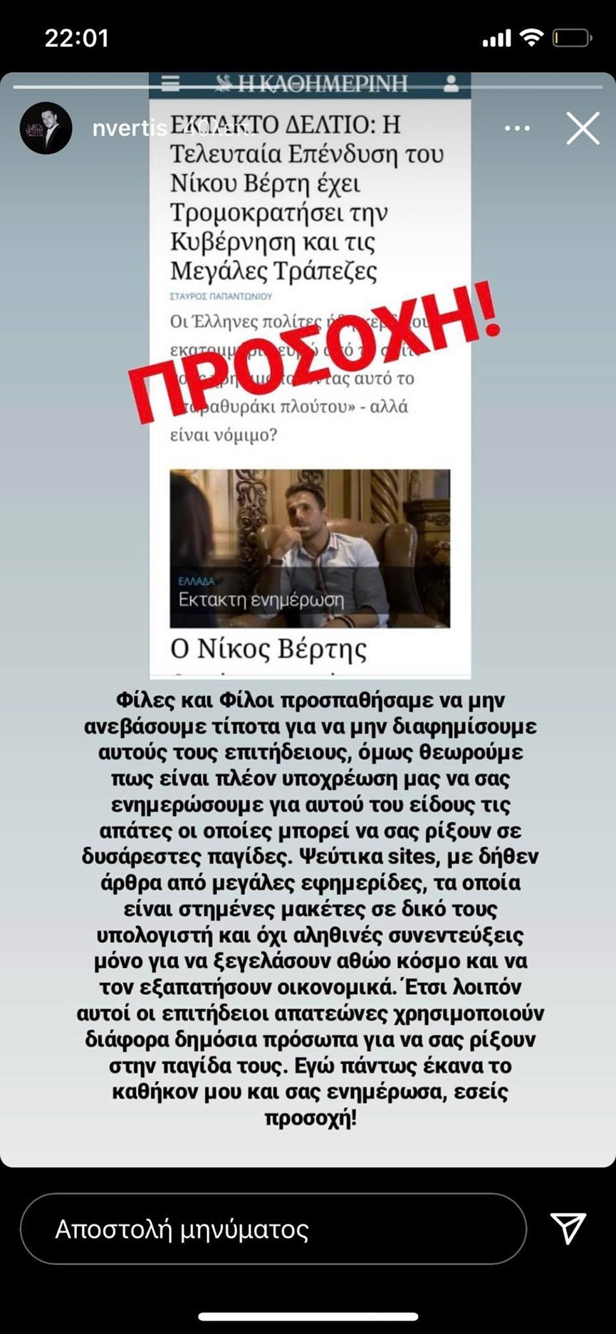«Έκτακτο Δελτίο: Η τελευταία επένδυση του Νίκου Βέρτη έχει τρομοκρατήσει την κυβέρνηση και τις μεγάλες τράπεζες», αναφέρεται στο αναληθές δημοσίευμα που αφορά τον Νίκο Βέρτη.