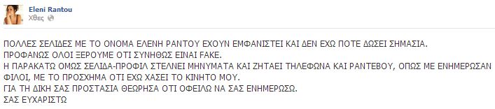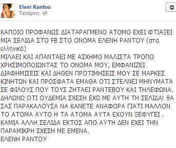 Μπλεξίματα τις τελευταίες ημέρες για τη δημοφιλή ηθοποιό Ελένη Ράντου. Με μία ανάρτησή της στη σελίδα της στο facebook την Τετάρτη, κάνει λόγο για χρήστη που παριστάνει την ίδια και χρησιμοποιεί το όνομά της ακόμα και για διαφημιστικούς λόγους.