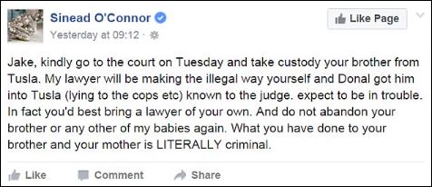 Το σενάριο της αυτοκτονίας ενισχύει και το τελευταίο μήνυμα της τραγουδίστριας στον προσωπικό της λογαριασμό στο Facebook στο οποίο η Ο΄Κόνορ ζητά από τον γιο της να πάει στο δικαστήριο την Τρίτη για να αναλάβει την επιμέλεια του αδελφού του.