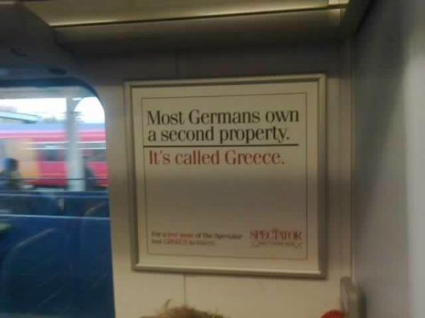 Η πινακίδα γράφει: ” Οι περισσότεροι Γερμανοί έχουν και μια δεύτερη ιδιοκτησία. Λέγεται Ελλάδα”.