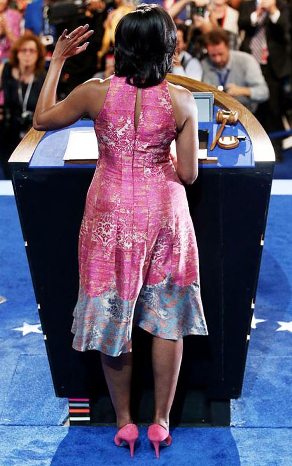 Η Πρώτη Κυρία των ΗΠΑ, Μichelle Obama μας έχει συνηθίσει σε εξαιρετικά κομψές εμφανίσεις. Το σύνολο που επέλεξε για την ομιλία της στο Συνέδριο των Δημοκρατικών στην Σάρλοτ της Βόρειας Καρολίνας δεν αποτελεί εξαίρεση…Και πάλι εμπιστεύτηκε την Αμερικανίδα σχεδιάστρια μόδας Tracy Reese (που σχεδίασε και το κοστούμι του Barack Obama για το εξώφυλλο ου περιοδικού Ebony, τεύχος Μαίου). Οι σοέντ γόβες της φέρουν την υπογραφή της J. Crew.