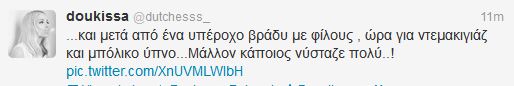 «..και μετά από ένα υπέροχο βράδυ με φίλους , ώρα για ντεμακιγιάζ και μπόλικο ύπνο…Μάλλον κάποιος νύσταζε πολύ..!», έγραψε νωρίτερα στο Twitter ανεβάζοντας και τη συγκεκριμένη φωτογραφία.
