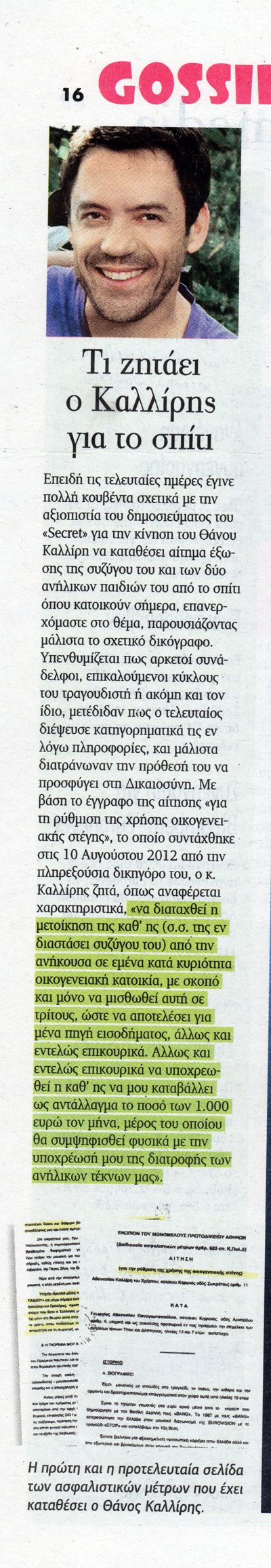 Αποκαλυπτικά έγγραφα σχετικά με την κίνηση του γνωστού τραγουδιστή, Θάνου Καλλίρη, να καταθέσει αίτημα έξωσης της συζύγου και των δύο ανήλικων παιδιών του από το σπίτι που κατοικούν, δημοσιεύει η εφημερίδα «Παραπολιτικά».