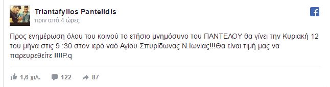 Στο προφίλ του στο Facebook ο Τριαντάφυλλος Παντελίδης ανακοίνωσε ότι το το ετήσιο μνημόσυνο του τραγουδιστή θα γίνει αυτή την Κυριακή 12 Φεβρουαρίου, στις 9.30 το πρωί στον Ιερό Ναό του Αγίου Σπυρίδωνα.