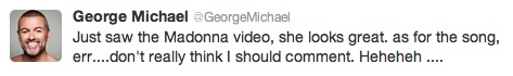 Το ολοκαίνουργιο βίντεο της Μadonna κυκλοφόρησε κι όλοι ασχολούνται μαζί της!Βρέθηκε, λοιπόν, ο πρώτος διάσημος που σχολίασε το νέο videoclip. Είναι ο George Michael, που πριν από λίγο έγραψε στο twitter του: