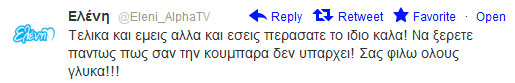 Η Νατάσα Θεοδωρίδου ήταν προσκεκλημένη σήμερα, στην εκπομπη “Ελένη”. Αλλωστε, η Ελένη Μενεγάκη της έχει αδυναμία και δεν το κρύβει…Μόλις πριν από λίγα λεπτά, έγραψε στο twitter της: