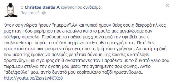 Ο Χρήστος Δάντης, μέσω Facebook, αποχαιρέτησε την ανιψιά του, Χρυσάνθη, την οποία είχε σαν αδελφή του, αφού η διαφορά ηλικίας τους ήταν πολύ μικρή, όπως ο ίδιος ανέφερε. Το “αντίο” του ήταν γεμάτο μνήμες και συγκίνηση.