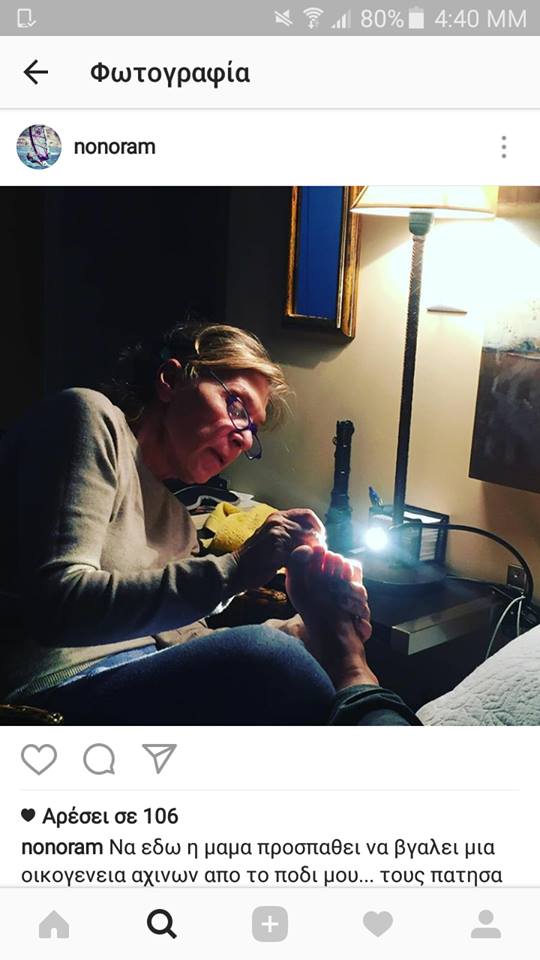 Ανεβάζοντας μία φωτογραφία στον προσωπικό της λογαριασμό στο Instagram, μοιράστηκε με τους διαδικτυακούς της φίλους, τη στιγμή που η μητέρα της προσπαθεί να της αφαιρέσει από το πόδι τα αγκάθια από μία «οικογένεια αχινών», όπως αναφέρει χαρακτηριστικά η ίδια.