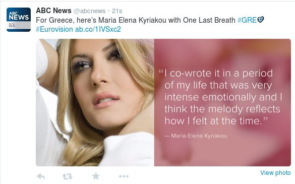 Μπορεί η Μαρία Έλενα Κυριάκου να κατέλαβε τη 19η θέση στο διαγωνισμό της Eurovision, με το «One last breath» να μην ενθουσίασε τους Ευρωπαίους, όμως το αμερικανικό δίκτυο ABC βρήκε καταπληκτική τόσο την ερμηνεία της όσο και την σκηνική της παρουσία.