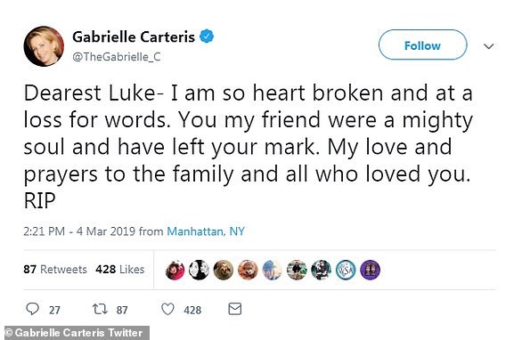 Η Γκαμπριέλ Καρτέρις, έγραψε στο twitter της “Αγαπημένε μου Λουκ, είμαι συντετριμμένοι και δεν έχω λόγια. Εσύ φίλε μου ήσουν μια γενναία ψυχή και άφησες το σημάδι σου. Η αγάπη μου και οι προσευχές μου στην οικογένειά σου και σε όσους σε αγαπούν. RIP”.