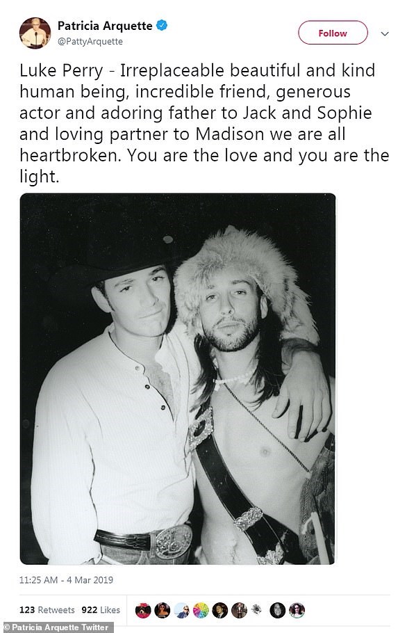 “Λουκ Πέρι – Αναντικατάστατος όμορφος και καλοσυνάτος άνθρωπος, απίστευτος φίλος, γενναιόδωρος ηθοποιός, υπέροχος πατέρας στον Τζακ και τη Σόφι και δοτικός σύντροφος στην Μάντισον. Όλοι είμαστε συντετριμμένοι. Εσύ είσαι η αγάπη και εσύ είσαι το φως” έγραψε η Πατρίσια Αρκέτ.