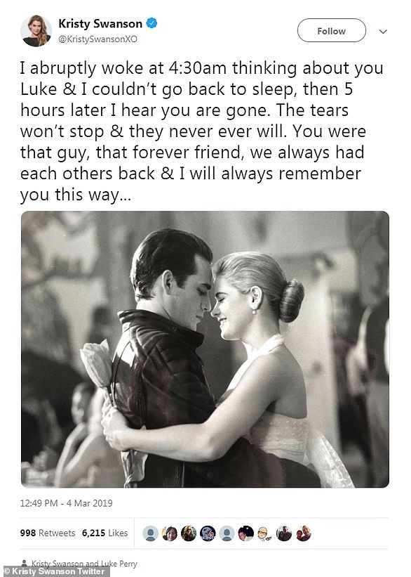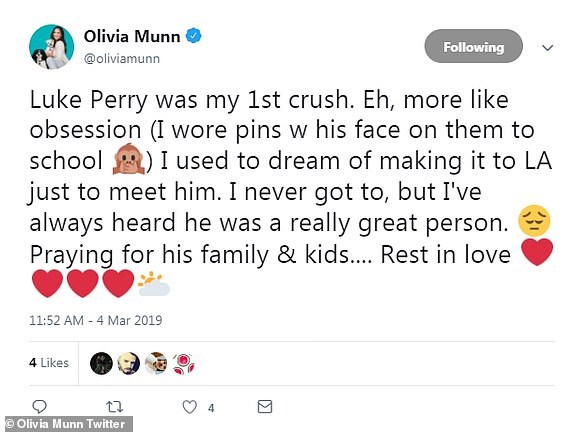 “Ο Λουκ Πέρι ήταν ο πρώτος μου έρωτας. Περισσότερο η εμμονή μου (φορούσα κονκάρδες με το πρόσωπό του πάνω στο σχολείο). Ονειρευόμουν να τα καταφέρω στο Λος Άντζελες για να τον γνωρίσω. Δεν τα κατάφερα, αλλά πάντα άκουγα ότι ήταν ένας εξαιρετικός άνθρωπος. Προσεύχομαι για την οικογένεια και τα παιδιά του… Αναπαύσου εν αγάπη” έγραψε η νεαρή ηθοποιός.
