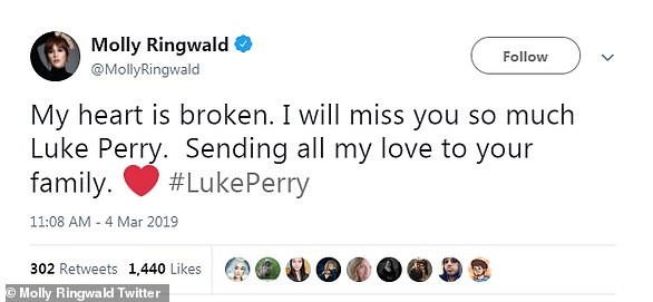 Η Μόλι Ρινγκουάρντ έγραψε “Η καρδιά μου είναι συντετριμμένη. Θα μου λείψεις τόσο πολύ Λουκ Πέρι. Στέλνω την αγάπη μου στην οικογένειά σου”