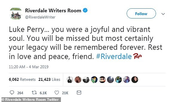 Οι ομάδα των σεναριογράφων του Riverdale αναφέρουν “Λουκ Πέρι… ήσουν μια χαρούμενη και ζωηρή ψυχή Θα λείψεις σε όλους αλλά σίγουρα το κληροδότημα σου θα το θυμόμαστε για πάντα. Αναπαύσου εν ειρήνη και αγάπη, φίλε”.