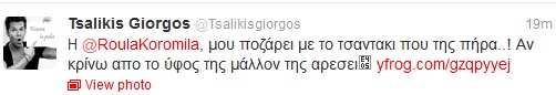 Ο Γιώργος Τσαλίκης ανέβασε στο Twitter φωτογραφίες με το δώρο που έκανε στη Ρούλα Κορομηλά για τα γενέθλιά της.Στη λεζάντα κάτω από τη φωτογραφία έγραψε: ”Η Ρούλα ποζάρει με το τσαντάκι που της πήρα..! Αν κρίνω απο το ύφος της μάλλον της αρεσει.”