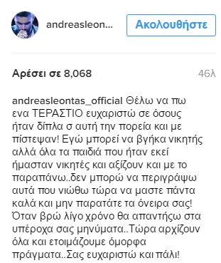 Mέσα από τον λογαριασμό του στο Instagram o νικητής του Χ-Factor, Ανδρέας Λέοντας ευχαρίστησε εκείνους που τον πίστεψαν, στέλνοντας παράλληλα το δικό του μήνυμα στους διαδικτυακούς του ακόλουθους, να μην παρατάνε τα όνειρα τους.