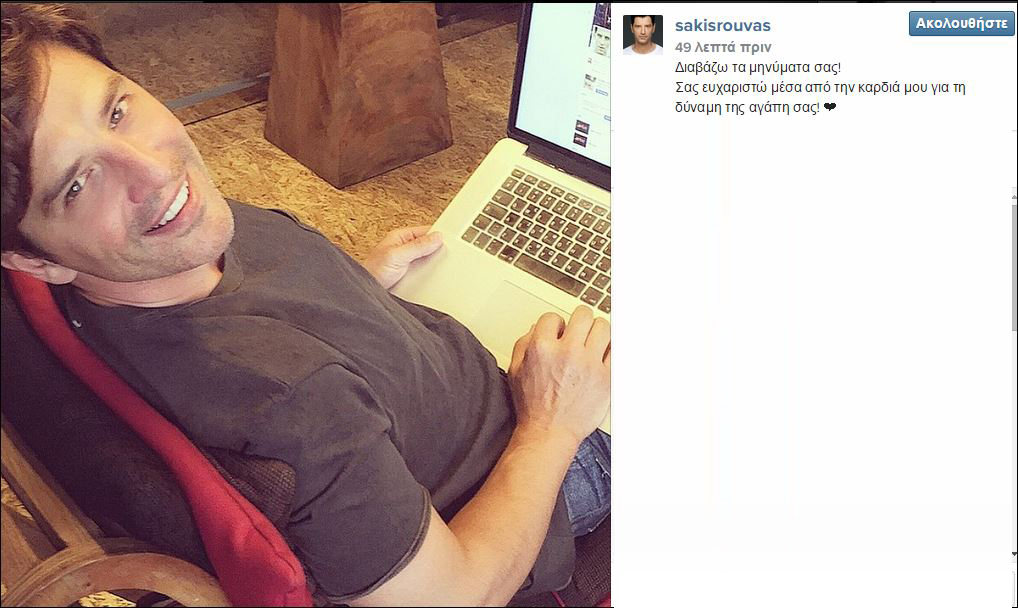 Καθισμένος σε μία καρέκλα και με το λάπτοπ στα χέρια του ο Σάκης έγραψε: «Διαβάζω τα μηνύματά σας! Σας ευχαριστώ μέσα από την καρδιά μου για τη δύναμη της αγάπης σας!».