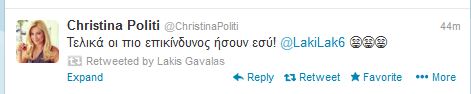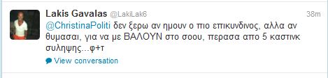 Ο Λάκης Γαβαλάς έγραψε στον προσωπικό του λογαριασμό στο twitter σε απάντηση της Χριστίνας Πολίτη ότι εκείνος τελικά ήταν ο πιο επικίνδυνος: “Δεν ξέρω αν ήμουν ο πιο επικίνδυνος, αλλά αν θυμάσαι για να με βάλουν στο σόου, πέρασα από 5 κάστινγκ σύλληψης” σχολίασε.