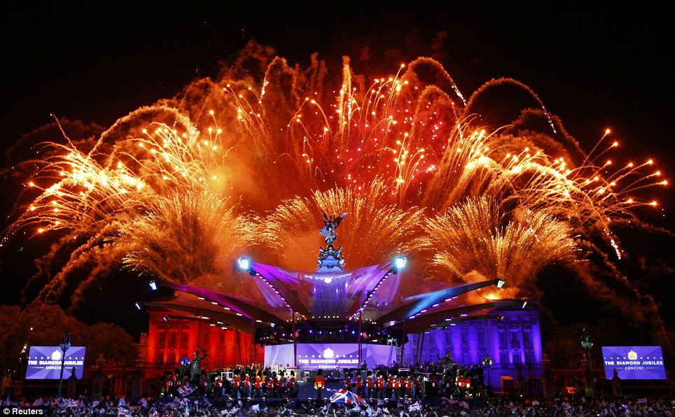 Η επέτειος της βασίλισσας Elizabeth II για την συμπλήρωση των 60 χρόνων στο θρόνο της Αγγλίας, έγινε εθνική υπόθεση!Εδώ και μέρες οι κάτοικοι του Λονδίνου και λάτρεις της 86χρονης βασίλισσας το διασκεδάζουν. Χθες το βράδυ, πάλι έκλεισαν τους δρόμους για να παρακολουθήσουν τη…βασιλική συναυλία, προς τιμήν της. Τα χιλιάδες πυροτεχνήματα έβαψαν τον ουρανό κόκκινο, δημιουργώντας μια φαντασμαγορική εικόνα.Η σκηνή είχε στηθεί μπροστά από τα ανάκτορα του Buckingham.