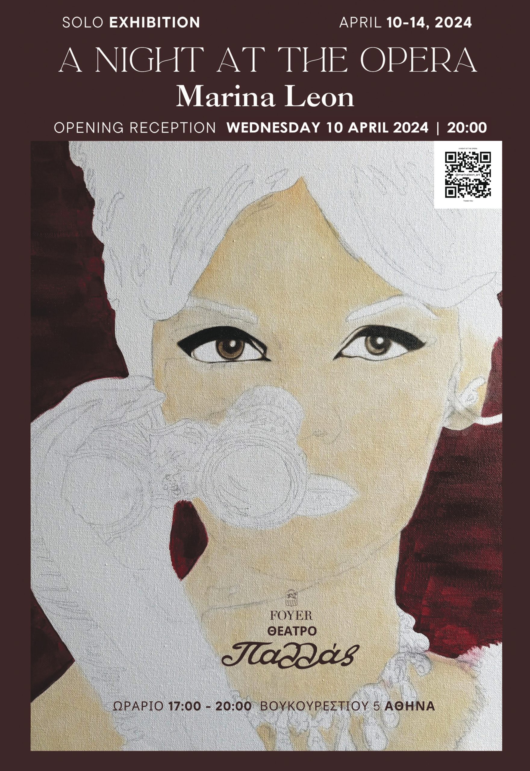Η ζωγράφος Μαρίνα Λεόν παρουσιάζει την έκθεσή της με τίτλο “Μια νύχτα στην όπερα”. Πρόκειται για 23 έργα διαφορετικών διαστάσεων με επίκεντρο την γυναίκα. Χρώματα, συναισθήματα και μουσικές αναμιγνύονται στην παλέτα της ζωής και μας χαρίζουν πολύχρωμες ιστορίες..