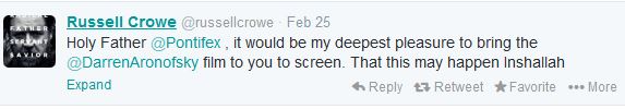 Στην προσπάθειά του να προωθήσει τη νέα του ταινία “Νώε” ο ηθοποιός Ράσελ Κρόου, κάλεσε μέσω twitter τον Πάπα Φραγκίσκο να παρακολουθήσει στο Βατικανό το βιβλικό έπος που σκηνοθέτησε ο Ντάρεν Αρονόφσκι.
