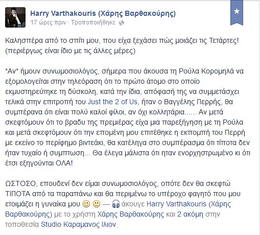 Mια εβδομάδα μετά την αποχώρησή του από το “Just the 2 of us”, ο Χάρης Βαρθακούρης με ένα αναλυτικό μήνυμά του στο facebook αναφέρεται στη Ρούλα Κορομηλά.