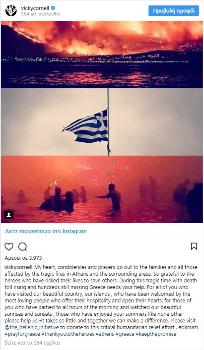 Λίγο νωρίτερα, την ίδια φωτογραφία με ανάλογο μήνυμα είχε δημοσιεύσει στον προσωπικό της λογαριασμό στο Instagram και η ελληνικής καταγωγής Βίκι Κορνέλ, χήρα του τραγουδιστή Κρις Κορνές, ο οποίος έβαλε πριν από μερικούς μήνες τέλος στη ζωή του.