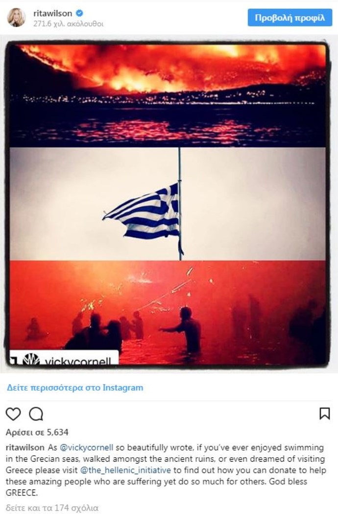 Το δικό της μήνυμα, θέλησε να στείλει στην Ελλάδα, η Ρίτα Γουίλσον. Η γνωστή ηθοποιός ελληνικής καταγωγής και σύζυγος του Τομ Χανκς, δημοσίευσε στο Instagram μία φωτογραφία από τις πυρκαγιές στην Ελλάδα.