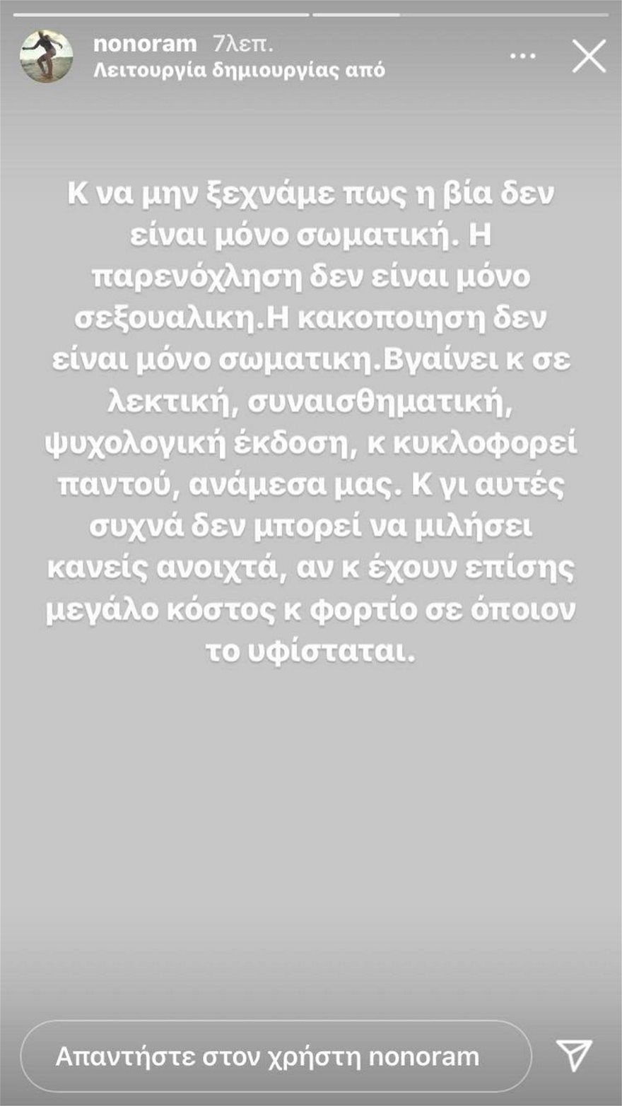 “Και μην ξεχνάμε πως η βία δεν είναι μόνο σωματική. Η παρενόχληση δεν είναι μόνο σεξουαλική. Η κακοποίηση δεν είναι μόνο σωματική. Βγαίνει και σε λεκτική, συναισθηματική, ψυχολογική έκδοση και κυκλοφορεί παντού. Ανάμεσά μας” έγραψε η παρουσιάστρια.