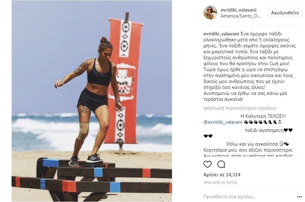 Τρεις μέρες μετά την αποχώρησή της από το Survivor, η Ευρυδίκη Βαλαβάνη ανέβασε μια νέα φωτογραφία στο Instagram, γράφοντας ένα μήνυμα για τα όσα έζησε τους τελευταίους πέντε μήνες, κατά τη συμμετοχή της στο δημοφιλές ριάλιτι.«Ένα όμορφο ταξίδι ολοκληρώθηκε μετά από 5 ολόκληρους μήνες.. Ένα ταξίδι γεμάτο όμορφες εικόνες και μαγευτικά τοπία. Ένα ταξίδι με ξεχωριστούς ανθρώπους και πολύτιμους φίλους που θα κρατήσω στην ζωή μου! Τώρα όμως ήρθε η ώρα να επιστρέψω στην αγαπημένη μου οικογένεια και τους δικούς μου ανθρώπους που με έχουν στηρίξει όσο κανένας άλλος! Ανυπομονώ να έρθω να σας κάνω μία τεράστια αγκαλιά», έγραψε χαρακτηριστικά η Ευρυδίκη.Δείτε την ανάρτηση: