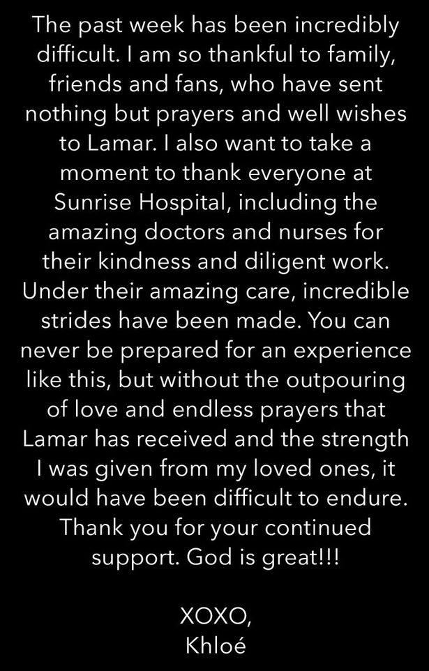 «Η περασμένη εβδομάδα ήταν τρομακτικά δύσκολη. Είμαι τόσο ευγνώμων στην οικογένεια, τους φίλους και τους θαυμαστές, που έστειλαν τις προσευχές τους και τις ευχές για να γίνει καλά ο Λαμάρ. Επίσης, θέλω να ευχαριστήσω τους πάντες στο Νοσοκομείο Sunrise, μεταξύ αυτών των καταπληκτικών γιατρών και των νοσοκόμων για την καλοσύνη και την εξαιρετική δουλειά τους. Υπό την δική τους καταπληκτική φροντίδα, έγιναν απίστευτα πράγματα. Ποτέ δεν μπορείς να είσαι προετοιμασμένος για μια εμπειρία σαν κι αυτή, αλλά χωρίς την αστείρευτη αγάπη και τις ατέλειωτες προσευχές για τον Λαμάρ και τη δύναμη που μου έδωσαν οι αγαπημένοι μου, θα ήταν πολύ δύσκολο να αντέξω. Σας ευχαριστώ για την συνεχιζόμενη υποστήριξή σας. Ο Θεός είναι μεγάλος. Φιλάκια, Κλόε» έγραψε.