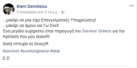 «…μακάρι να μην είχα Επαγγελματικές Υποχρεώσεις! …μακάρι να ήμουν και εγω Εκεί! Ένα μεγάλο ευχαριστώ στην παραγωγή του Survivor Greece για την πρόταση που μου έκανε!!! Καλή επιτυχία σε όλους!!!»