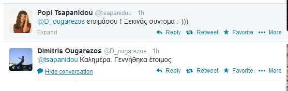 Η Πόπη Τσαπανίδου λίγο πριν βγει στον αέρα της εκπομπής της έγραψε στο twitter στον “ανταγωνιστή” της, Δημήτρη Ουγγαρέζο: “Ετοιμάσου! Ξεκινάς σύντομα”.