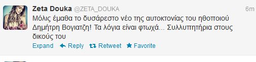 Τα συλλυπητήρια της στην οικογένεια του ηθοποιού Δημήτρη Βογιατζή, που έβαλε τέλος στη ζωή του, εκφράζει μέσω Twitter η Ζέτα Δούκα.
