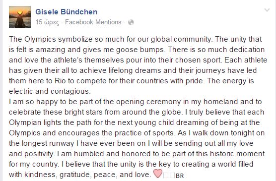 Η Ζιζέλ λίγο πριν από την τελετή έναρξης ανήρτησε ένα μήνυμα στο προσωπικό της προφίλ στο instagram όπου τονίζει ότι νιώθει μεγαλή τιμή που συμμετέχει σε μια τόσο σημαντική διοργάνωση.