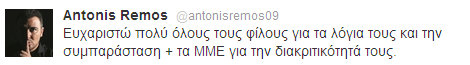 Είναι στιγμές που πονάνε…Ο Αντώνης Ρέμος πριν από λίγες ημέρες έχασε τον πατέρα του…Για να ευχαριστήσει όλους όσοι του συμπαραστάθηκαν, έστειλε το δικό του μήνυμα από το twitter, που σπάνια χρησιμοποιεί.Έγραψε λοιπόν: