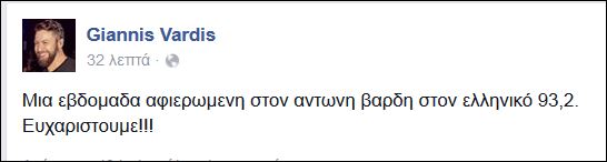 Με ανάρτησή του στην προσωπική του σελίδα στο Facebook, ο Γιάννης Βαρδής ευχαρίστησε τον Ελληνικό 93,2 για το εβδομαδιαίο αφιέρωμα του στον πατέρα του, Αντώνη.
