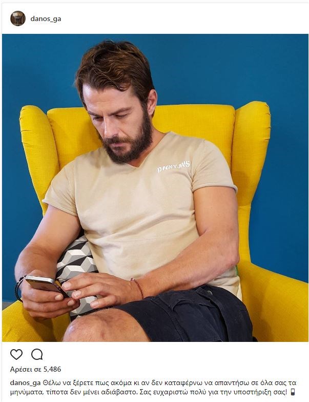 Μία νέα φωτογραφία ανέβασε σήμερα στον προσωπικό του λογαριασμό στο Instagram ο Γιώργος Αγγελόπουλος, και όπως ήταν αναμενόμενο απέσπασε χιλιάδες σχόλια και likes από τους διαδικτυακούς του φίλους.Μάλιστα, μέσω της ανάρτησης ο Ντάνος έστειλε και ένα μήνυμα προς τους θαυμαστές του. «Θέλω να ξέρετε πως ακόμα κι αν δεν καταφέρνω να απαντήσω σε όλα σας τα μηνύματα, τίποτα δεν μένει αδιάβαστο. Σας ευχαριστώ πολύ για την υποστήριξη σας!», έγραψε χαρακτηριστικά ο νικητής του Survivor.