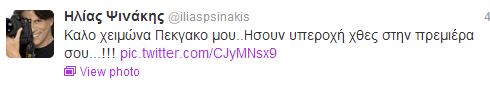 Ο Ηλίας Ψινάκης δεν είναι μόνο πολύ καλός φίλος της Πέγκυς Ζήνα και του Γιώργου Λύρα, αλλά είναι και κουμπάρος τους! Αυτό σημαίνει ότι δεν ήταν δυνατόν να λείπει από τη χθεσινή πρεμιέρα της τραγουδίστριας…Έγραψε στο twitter του: