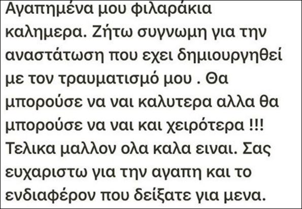 «Αγαπημένα μου φιλαράκια καλημέρα. Ζητώ συγγνώμη για την αναστάτωση που έχει δημιουργηθεί με τον τραυματισμό μου. Θα μπορούσε να ‘ναι καλύτερα, αλλά θα μπορούσε να’ ναι και χειρότερα!!! Τελικά μάλλον όλα καλά είναι. Σας ευχαριστώ για την αγάπη και το ενδιαφέρον που δείξατε για μένα».