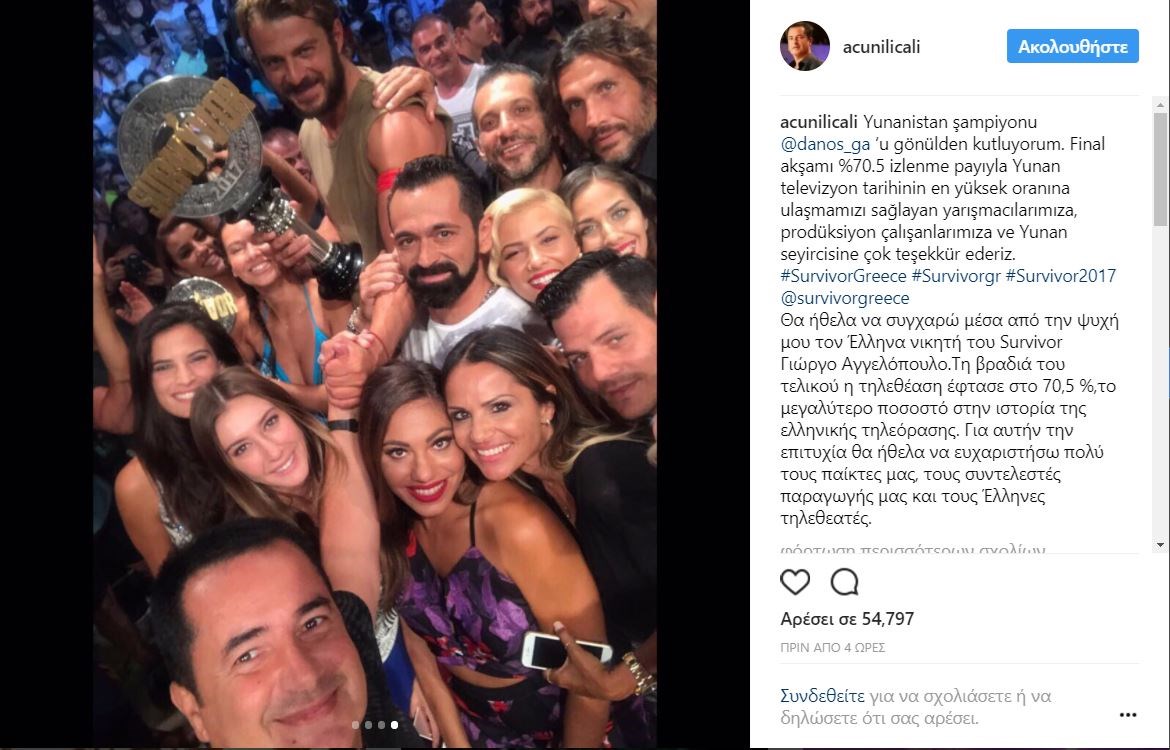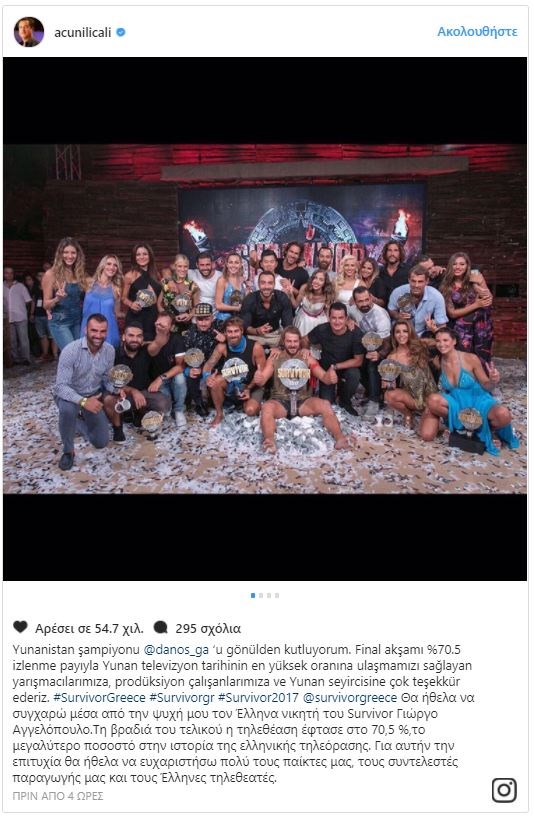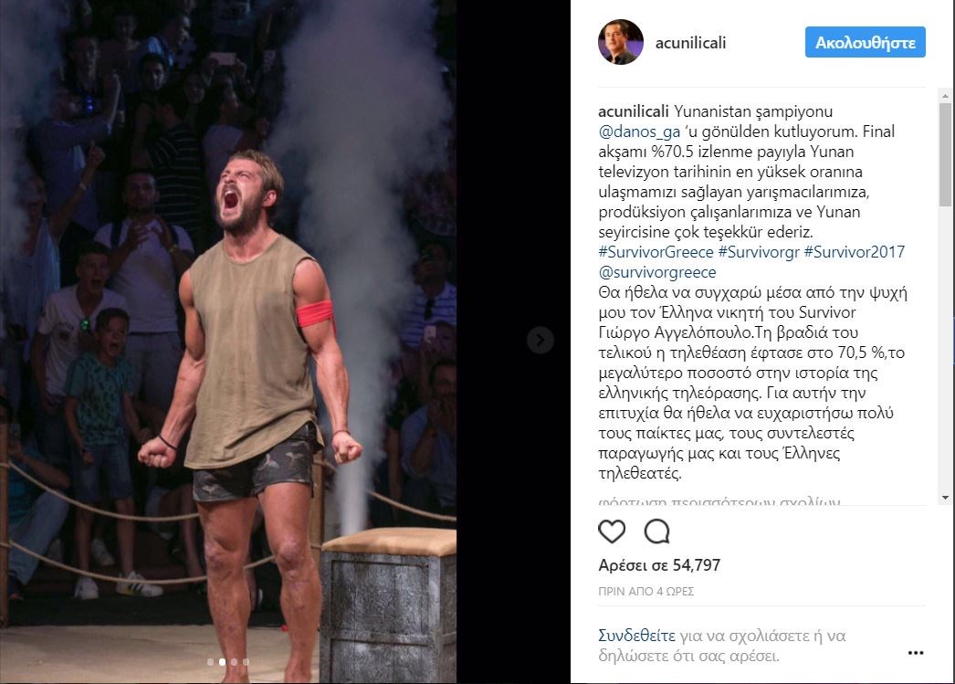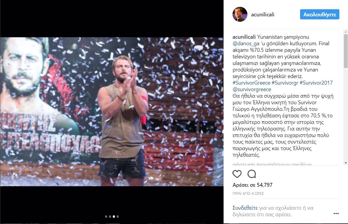 «Θα ήθελα να συγχαρώ μέσα από την ψυχή μου τον Έλληνα νικητή του Survivor, Γιώργο Αγγελόπουλο. Τη βραδιά του τελικού η τηλεθέαση έφτασε στο 70,5 %, το μεγαλύτερο ποσοστό στην ιστορία της ελληνικής τηλεόρασης. Για αυτήν την επιτυχία θα ήθελα να ευχαριστήσω πολύ τους παίκτες μας, τους συντελεστές παραγωγής μας και τους Έλληνες τηλεθεατές», έγραψε χαρακτηριστικά.