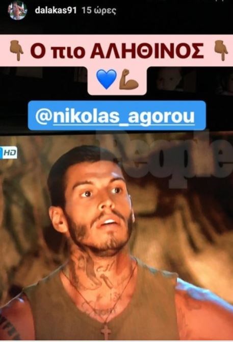 Μάλιστα, ο 26χρονος δεν δίστασε μέσα από τον προσωπικό του λογαριασμό στο instagram να στηρίξει τον φίλο του, Νικόλα, το βράδυ της Τρίτης, όταν βγήκε πρώτος υποψήφιος προς αποχώρηση.