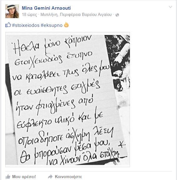 «Ήθελα μόνο κάποιον στοιχειώδες έξυπνο να καταλάβει πως όλες μου οι ευαίσθητες στιγμές ήταν φτιαγμένες από εύφλεκτο υλικό και με οποιαδήποτε άσχημη λέξη θα μπορούσαν να γίνουν όλα στάχτη», ήταν το μήνυμα της Μίνας Αρναούτη στο προφίλ της στο facebook.