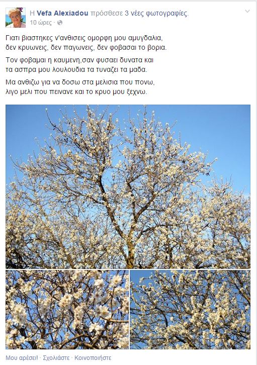 Μέσα από τον προσωπικό της λογαριασμό στο facebook, η Βέφα Αλεξιάδου μοιράστηκε με τους διαδικτυακούς της φίλους ένα ποίημα και φωτογραφίες ανθισμένης αμυγδαλιάς.