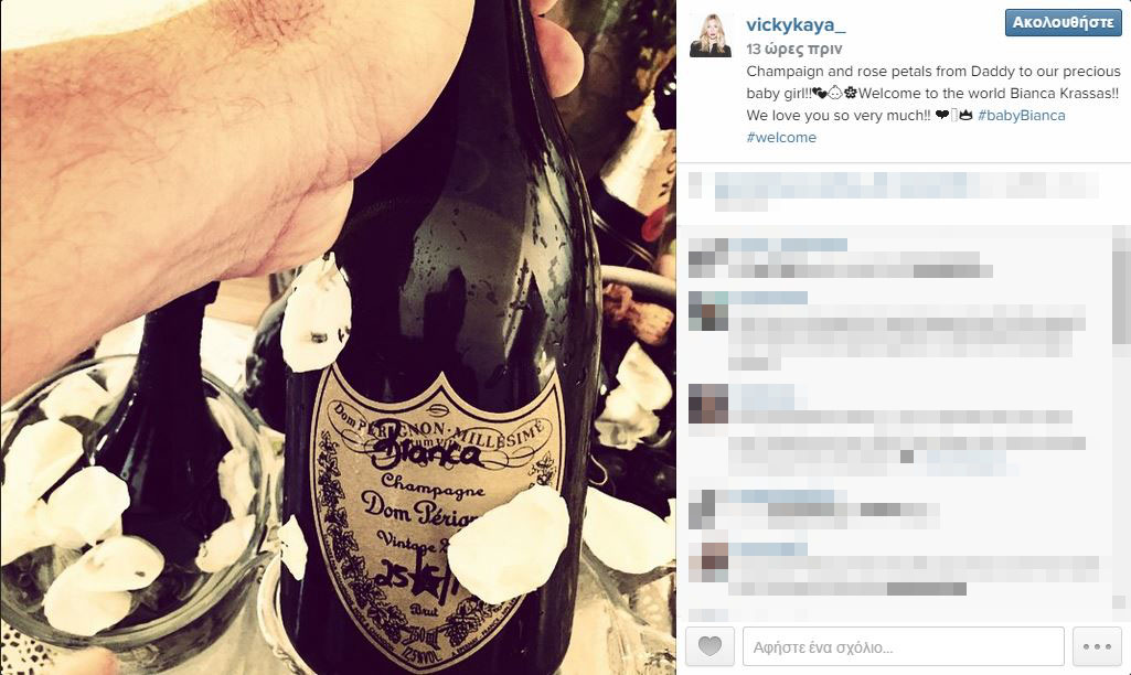 Μάλιστα, η τρισευτυχισμένη μανούλα έγραψε κάτω από τη φωτογραφία: «Σαμπάνια και ροδοπέταλα από τον μπαμπά στο πολύτιμο κοριτσάκι μας!! Καλώς ήρθες Bianca Κρασσά!! Σε αγαπάμε τόσο πολύ!!