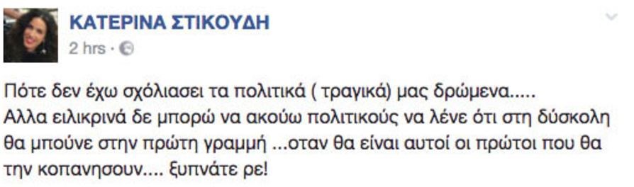 «Πότε δεν έχω σχολιάσει τα πολιτικά ( τραγικά) μας δρώμενα….. Αλλά ειλικρινά δε μπορώ να ακούω πολιτικούς να λένε ότι στη δύσκολη θα μπούνε στην πρώτη γραμμή …όταν θα είναι αυτοί οι πρώτοι που θα την κοπανήσουν…. ξυπνάτε ρε!» έγραψε χαρακτηριστικά η νεαρή τραγουδίστρια.