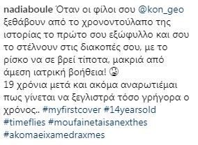 Η Νάντια Μπουλέ ανέβασε στον προσωπικό της λογαριασμό στο Instagram το πρώτο εξώφυλλο στην καριέρα της, σε ηλικία μόλις… 14 ετών! Η Νάντια το 1998 είχε φωτογραφηθεί για το περιοδικό «Σούπερ Κατερίνα».«Όταν οι φίλοι σου ξεθάβουν από το χρονοντούλαπο της ιστορίας το πρώτο σου εξώφυλλο και σου το στέλνουν στις διακοπές σου, με το ρίσκο να σε βρει τίποτα, μακριά από άμεση ιατρική βοήθεια! 19 χρόνια μετά και ακόμα αναρωτιέμαι πώς γίνεται να ξεγλιστρά τόσο γρήγορα ο χρόνος..», έγραψε χαρακτηριστικά η ηθοποιός.
