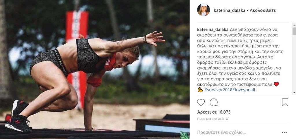 Η Kατερίνα Δαλάκα μέσω του προσωπικού της λογαριασμού στο Instagram εξέφρασε την ευγνωμοσύνη της για την αγάπη που της έδειξε ο κόσμος, στην πρώτη, ουσιαστικά, δημόσια δήλωσή της μετά την ανακοίνωση των αποτελεσμάτων του Survivor 2 και την ήττα της από τον Ηλία Γκότση.