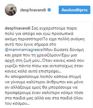 “Σας ευχαριστούμε πάρα πολύ για απόψε και εγώ προσωπικά ακόμη περισσότερο! Το είχα πολλή ανάγκη αυτό που έγινε σήμερα στο Μamma Mia! Μου δώσατε δύναμη και χαρά που τη χρειαζόμουν! Έχω μια αρχή στη ζωή μου…Όταν κάνεις κακό σου γυρίζει πάντα πίσω και αντιστοίχως όταν κάνεις καλό αυτό επιστρέφει…