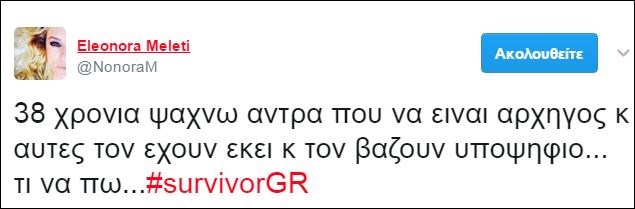 Η Ελεονώρα Μελέτη βλέπει φανατικά το reality του Survivor,με τρανή απόδειξη τα σχόλια που κάνει στα μέσα κοινωνικής δικτύωσης για όσα λαμβάνουν χώρα στον Άγιο Δομίνικο.Ωστόσο, από ότι φαίνεται ο Γιώργος Αγγελόπουλος είναι αυτός που έχει προκαλέσει το ενδιαφέρον της γνωστής παρουσιάστριας, γράφοντας στο twitter: «38 χρόνια ψάχνω άντρα που να είναι αρχηγός και αυτές τον έχουν εκεί και τον βάζουν υποψήφιο… τι να πω…».